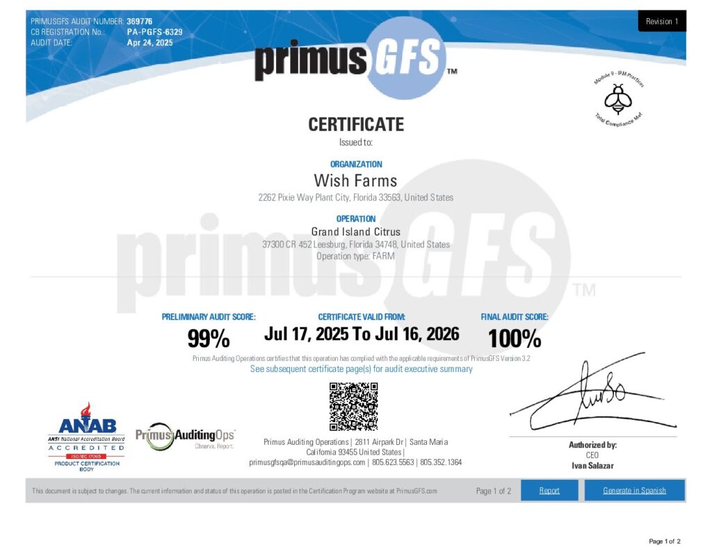 Primus Labs GFS Certified A-Rating: We maintain this internationally recognized certification. It ensures that our produce meets the highest standards of safety and integrity.